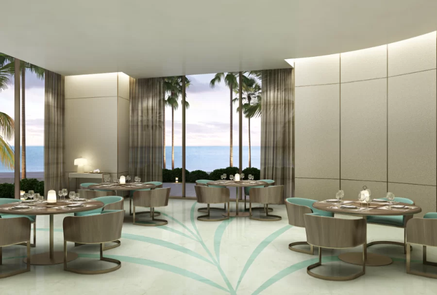 Restaurante y bar privados frente al mar con asientos al aire libre, así como delivery en la residencia